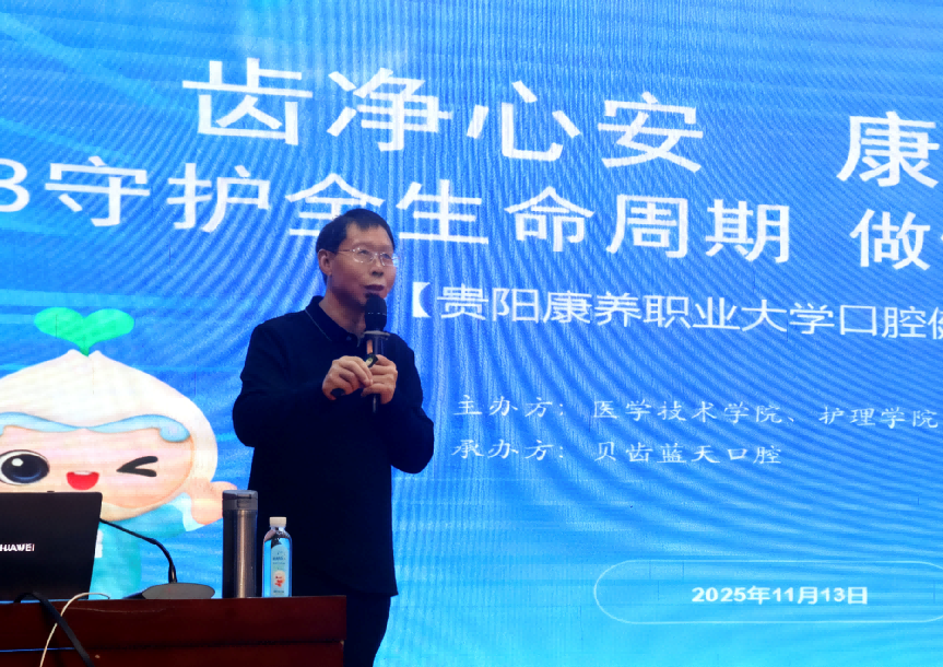 2025 年 11 月 13 日,医学技术学院联合贝齿蓝天口腔走进贵阳康养职业大学学术报告厅,为医学技术专业 23 级、24 级、25 级全体学生及口腔医学技术教研室教师,带来了一场主题为 “齿净心安,康养相伴” 的口腔健康专题讲座。