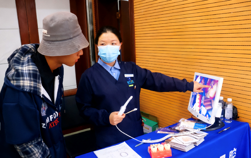 互动环节中,贝齿蓝天口腔的医生团队现场使用专业仪器为学生进行口腔扫描检查,针对扫描结果,逐一解析学生的口腔健康状况,提供个性化护理建议,并指导大家正确使用相关检查仪器。整场讲座内容充实、实用性强,同学们全程专注听讲,积极参与互动。