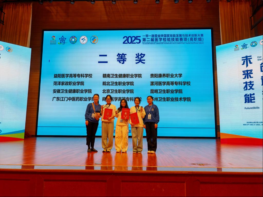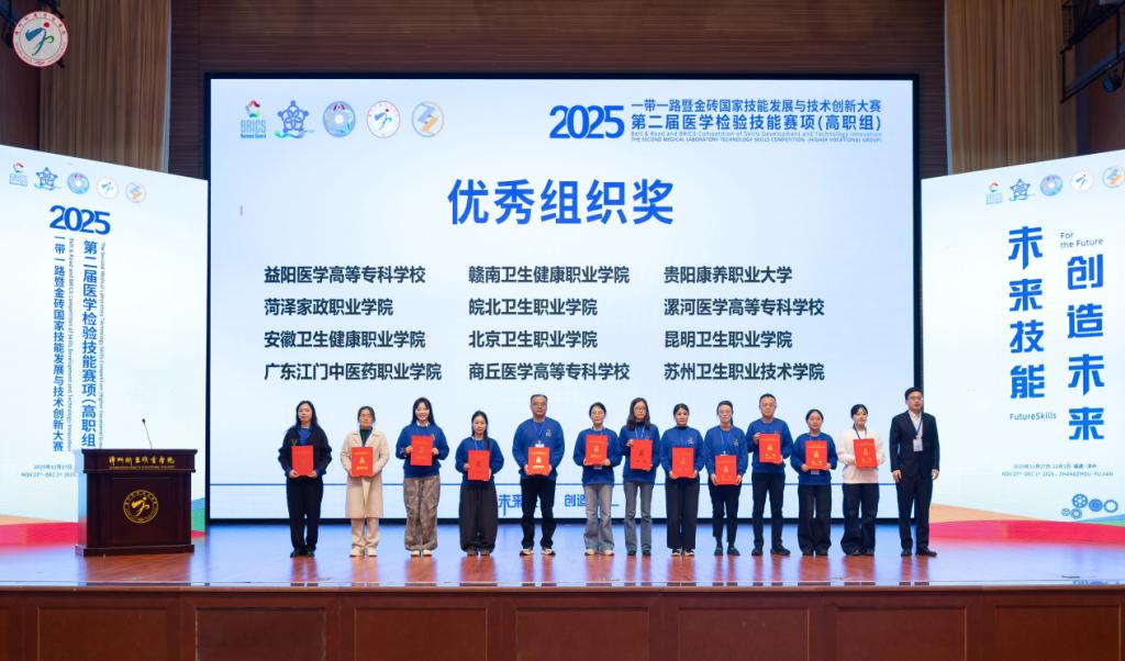 2025年 11 月 27 日至 12 月 1 日,2025 “一带一路”暨金砖国家技能发展与技术创新大赛第二届医学检验技能赛项高职组竞赛在漳州卫生职业学院圆满落幕。我院医学检验技术专业师生组成的参赛团队脱颖而出,斩获团队二等奖,指导教师秦雯、冉叶倩荣获优秀指导教师称号,同时获评优秀组织奖。